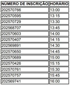 As bancas examinadoras serão realizadas no dia 02 de fevereiro de 2026, no período da tarde, seguindo o cronograma de horários individuais abaixo: